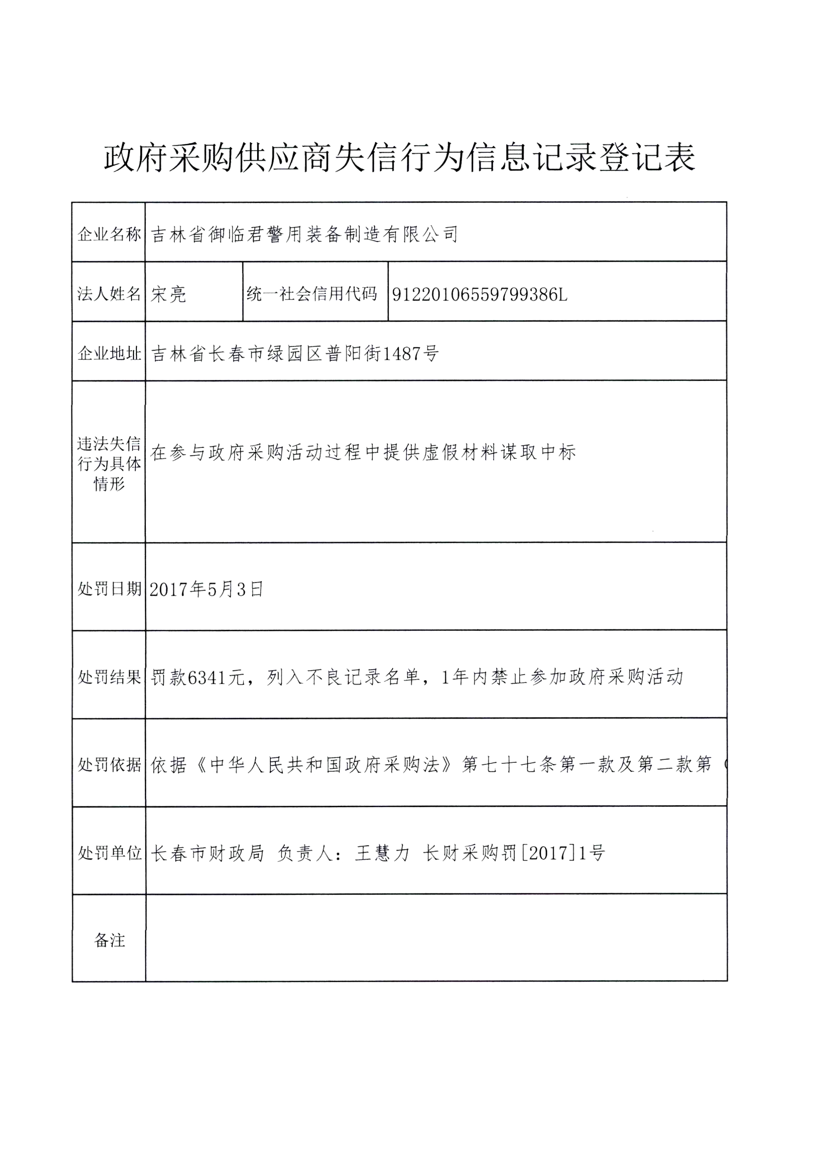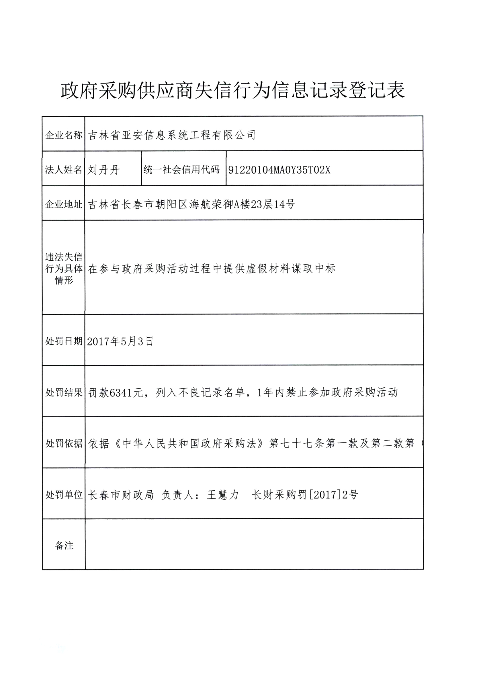 (长财采购罚〔2017〕2号)行政处罚决定